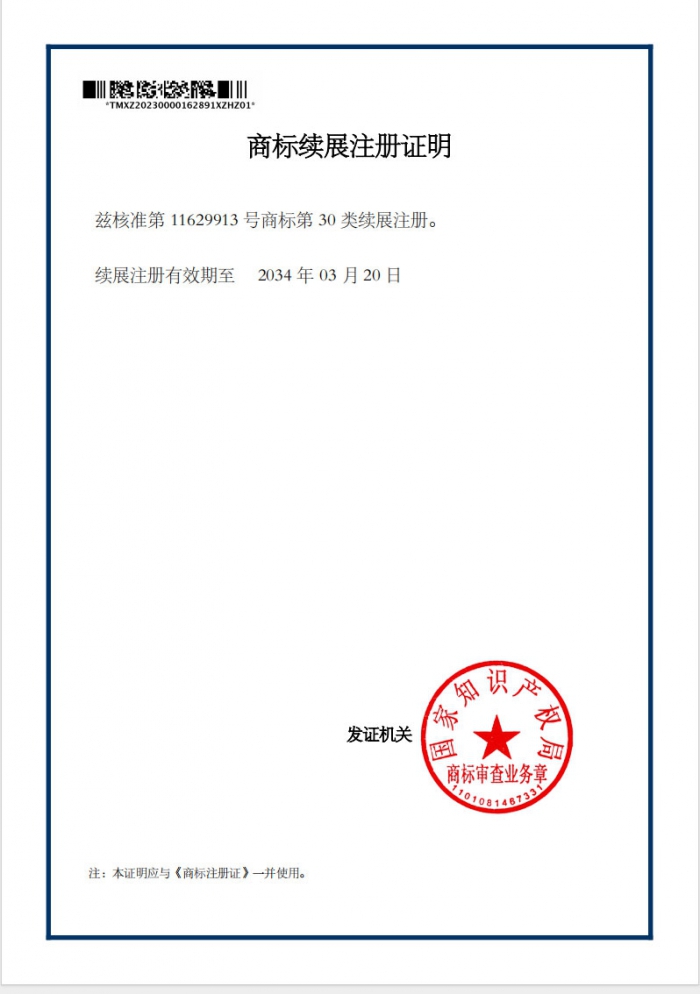 商標(biāo)續(xù)展注冊(cè)證明